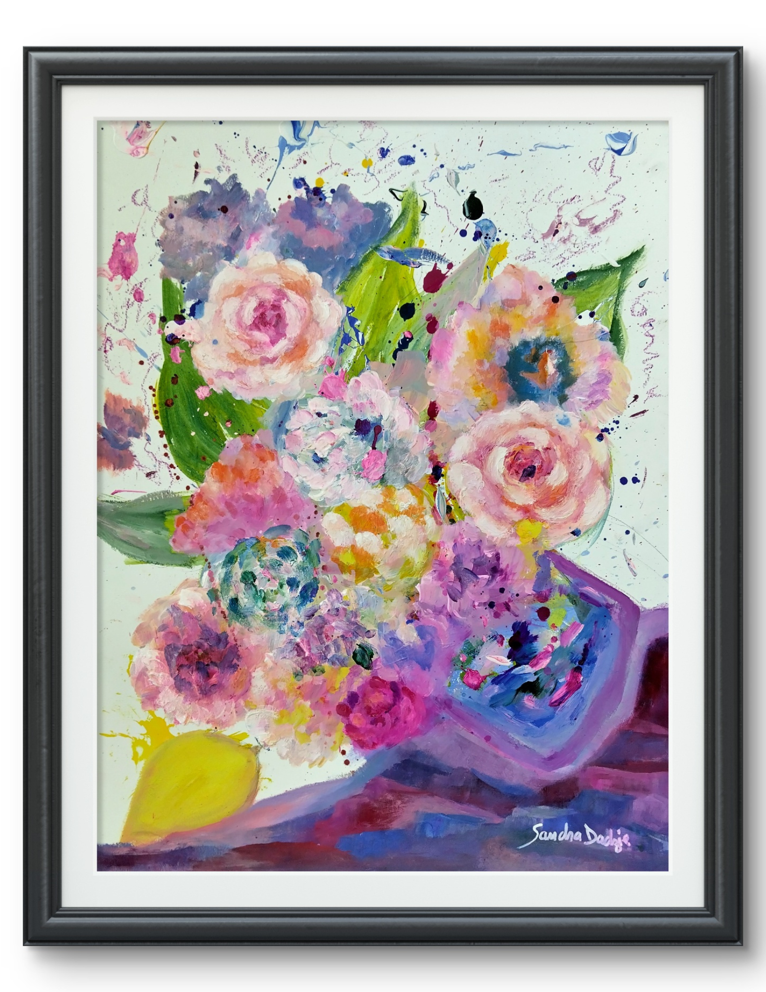 is a vibrant floral painting that speaks the language of love, emotion, and divine beauty. The bouquet, arranged gracefully in a glass vase, bursts with rich, warm tones orange, pinks, and golds symbolizing deep affection of emotional and spiritual passion ,a passion of heart . Each petal seems alive with feeling, as if echoing the heartbeat of passion and devotion. The light reflecting through the vase adds purity to the intensity, revealing that true passion flows from a heart touched by love and grace.