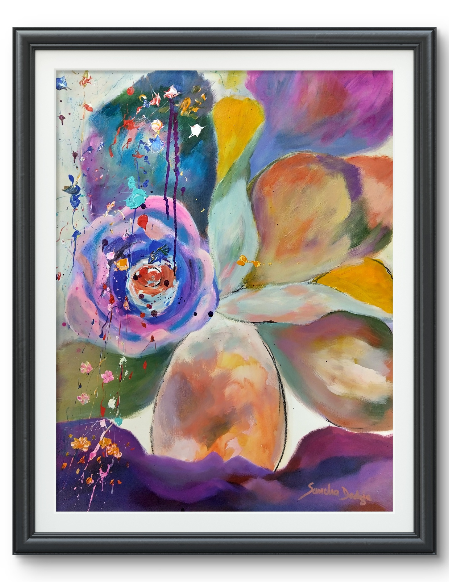 Floral abstract painting called RENAISSANCE. Out of broken soil, heaven paints a bloom. A rebirth of joy, understanding, love, and everything that has been lost and stolen.