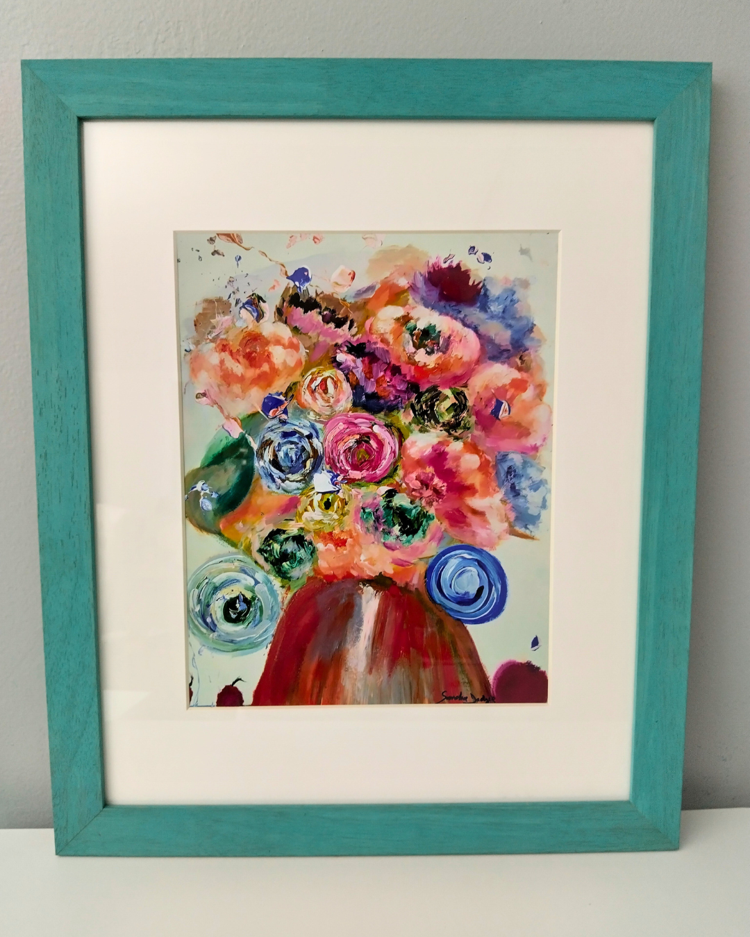 Caress of Morning Dew (GICLEE PRINT FRAME ART) wall art frame in turquoise classic wood is a delicate floral painting that captures the gentle touch of dawn. Each petal glistens with tiny droplets of dew, kissed by the first light of morning. Soft pastel hues shimmer as if nature itself is whispering a quiet greeting to the day. The painting evokes freshness, renewal, and tender serenity, a moment where time slows, and the heart feels the gentle embrace of nature’s love.