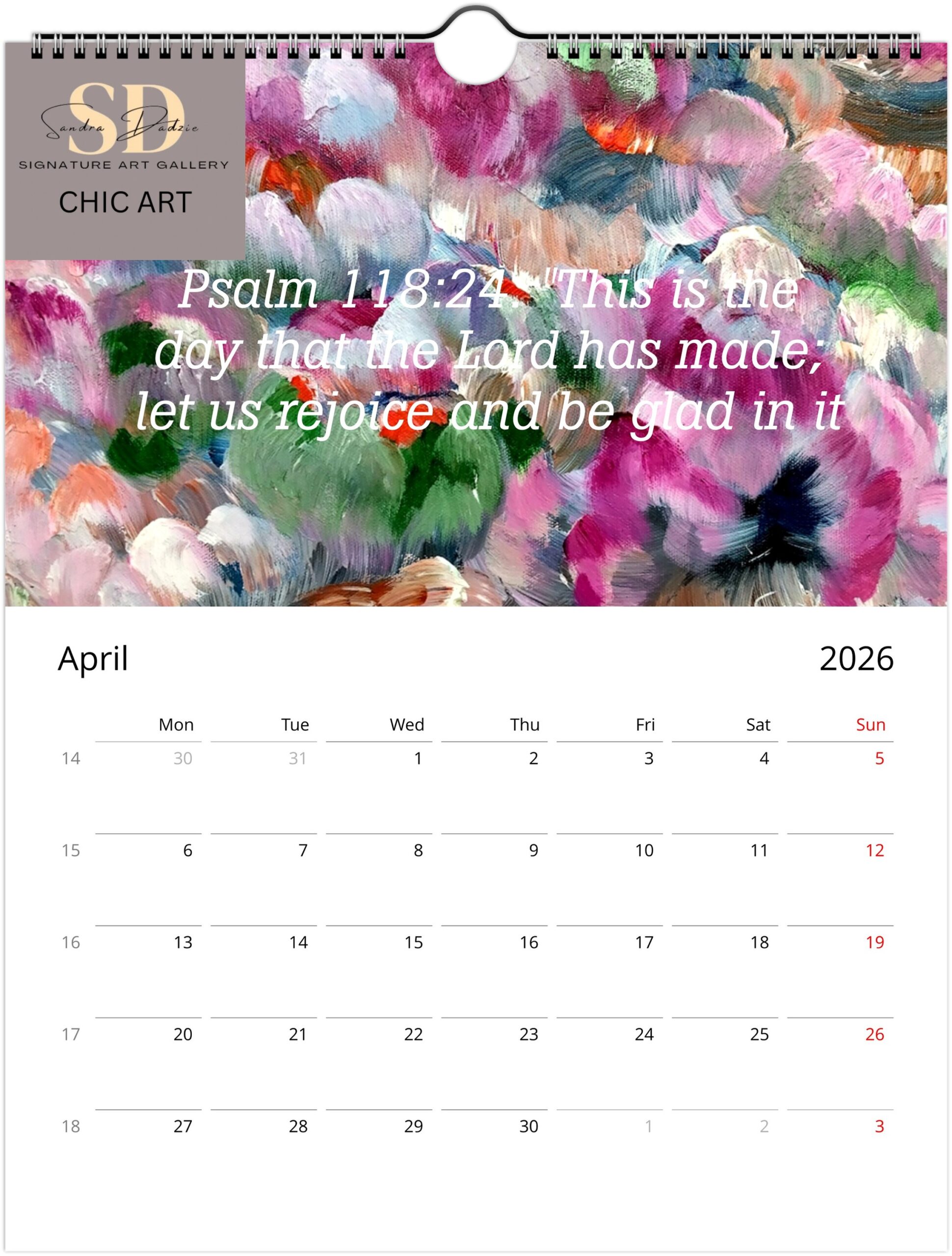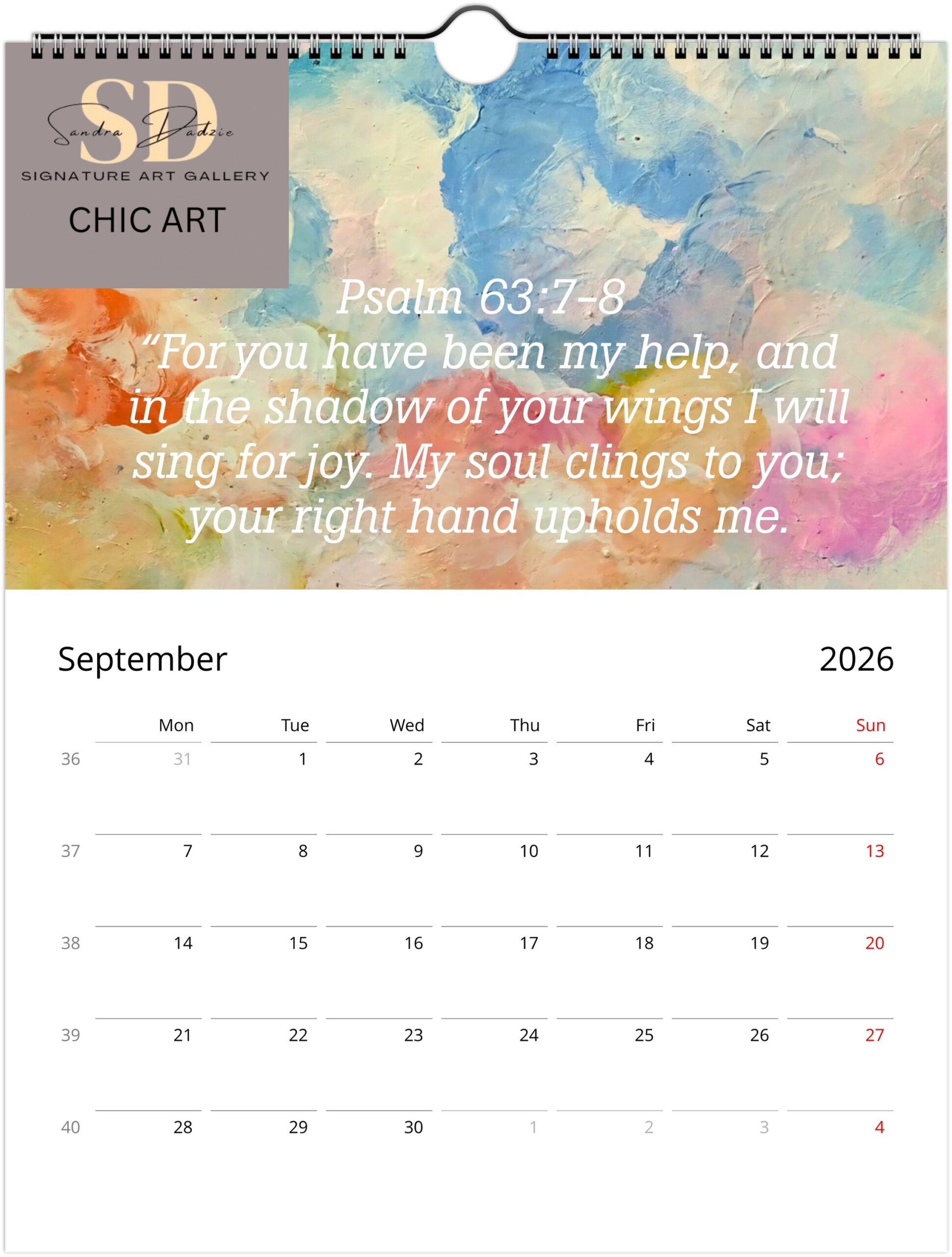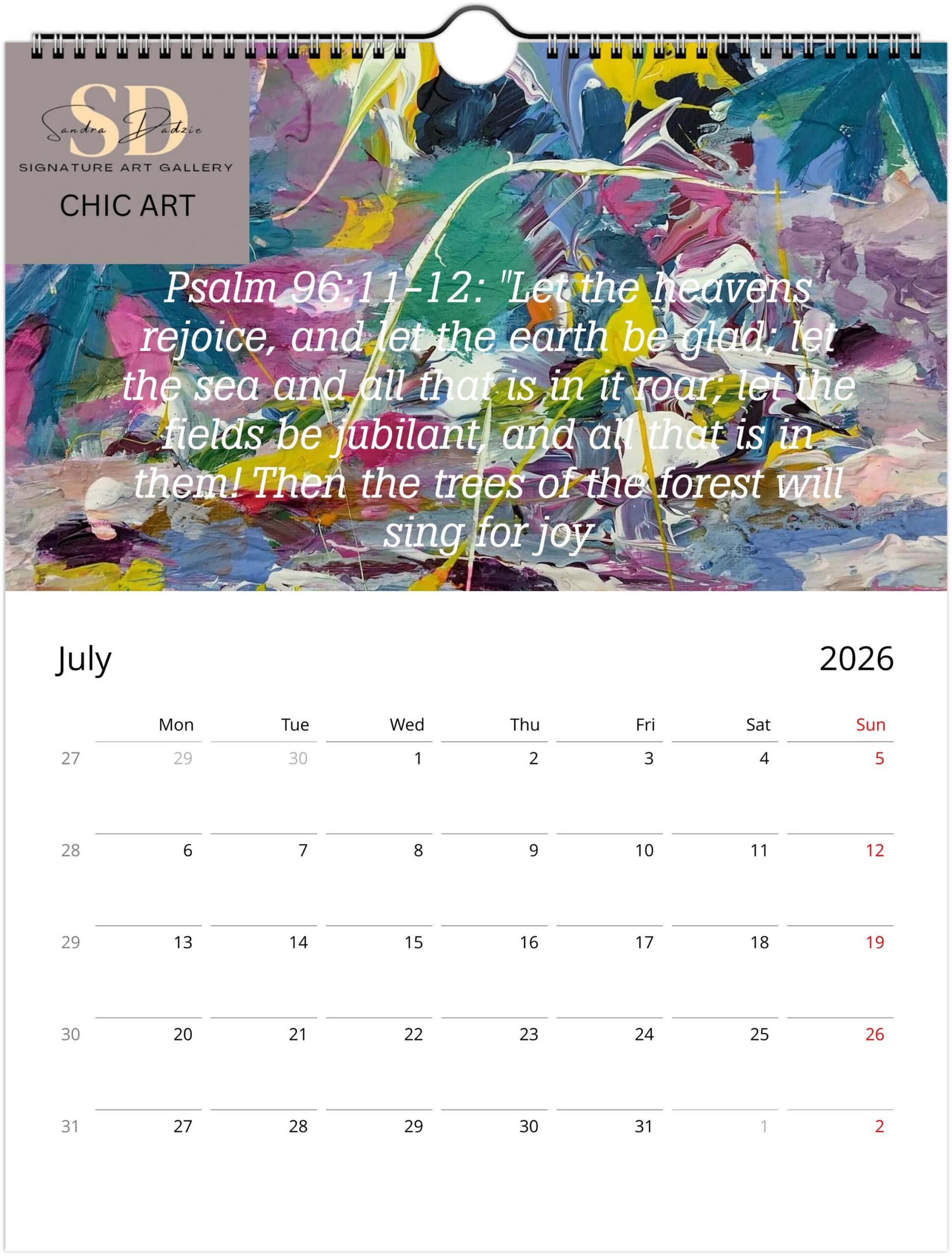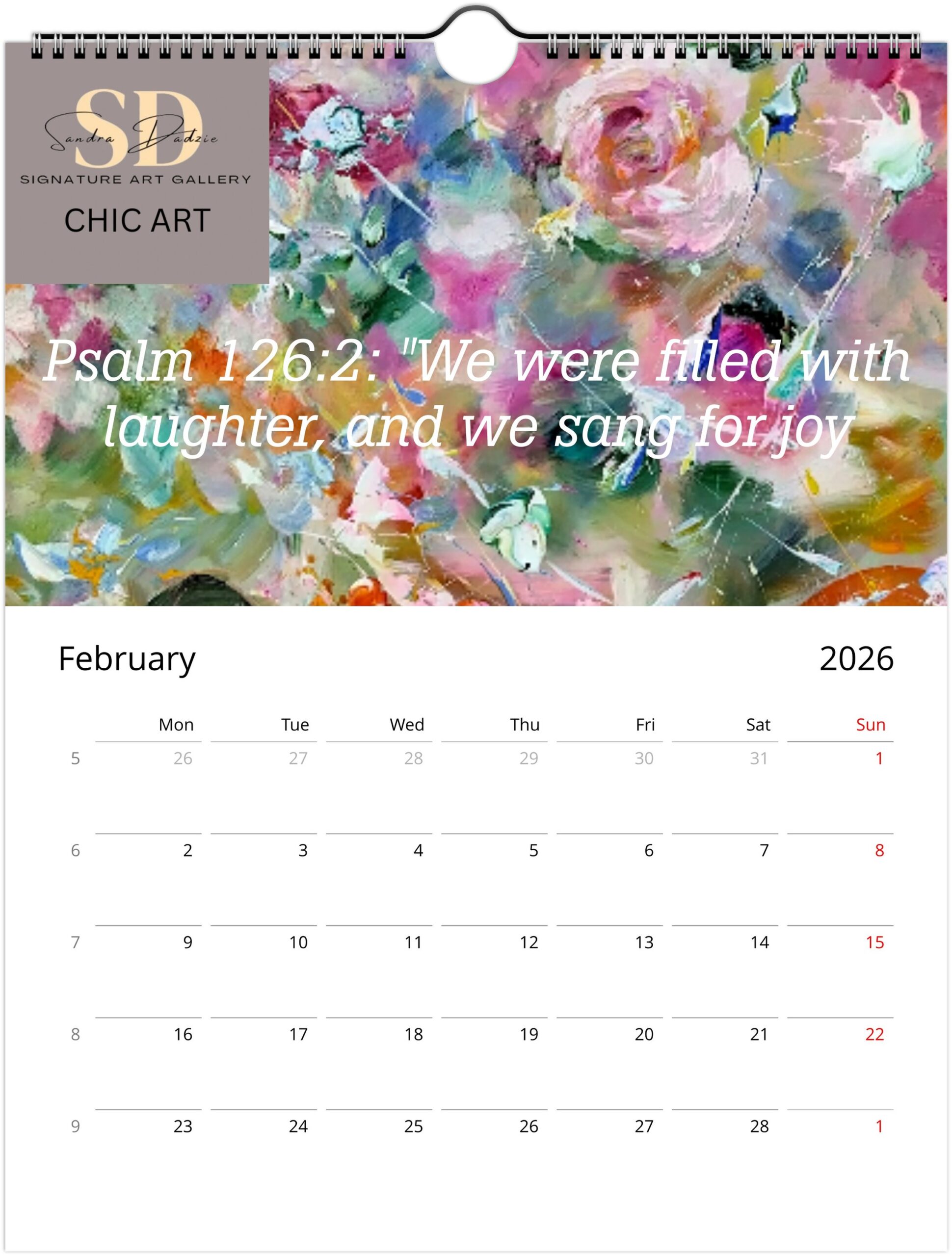 Celebrate each new month of 2026 with beauty, color, and encouragement. This inspirational art calendar combines vibrant, heartfelt artwork with joyful Bible verses to fill your year with peace, purpose, and positivity.