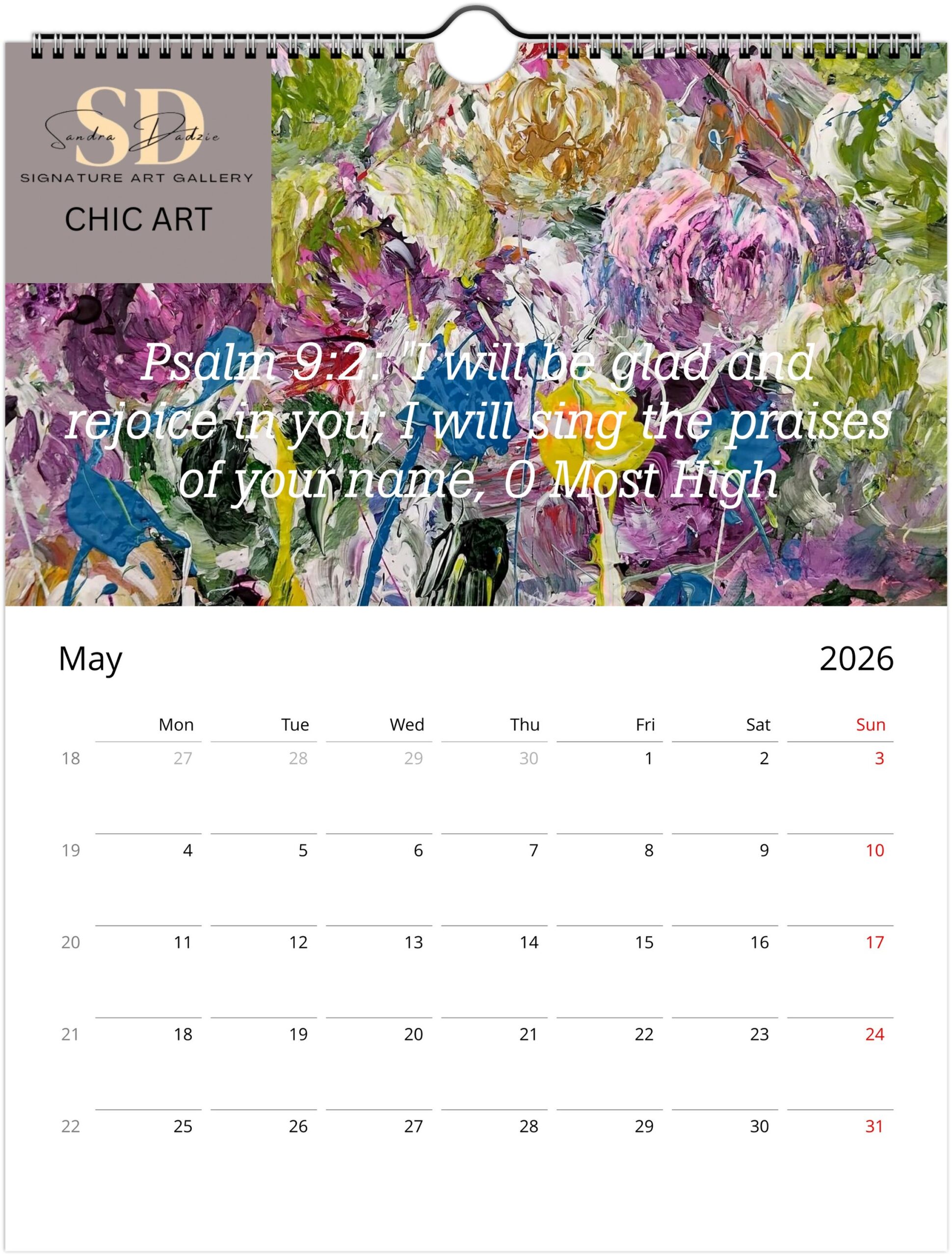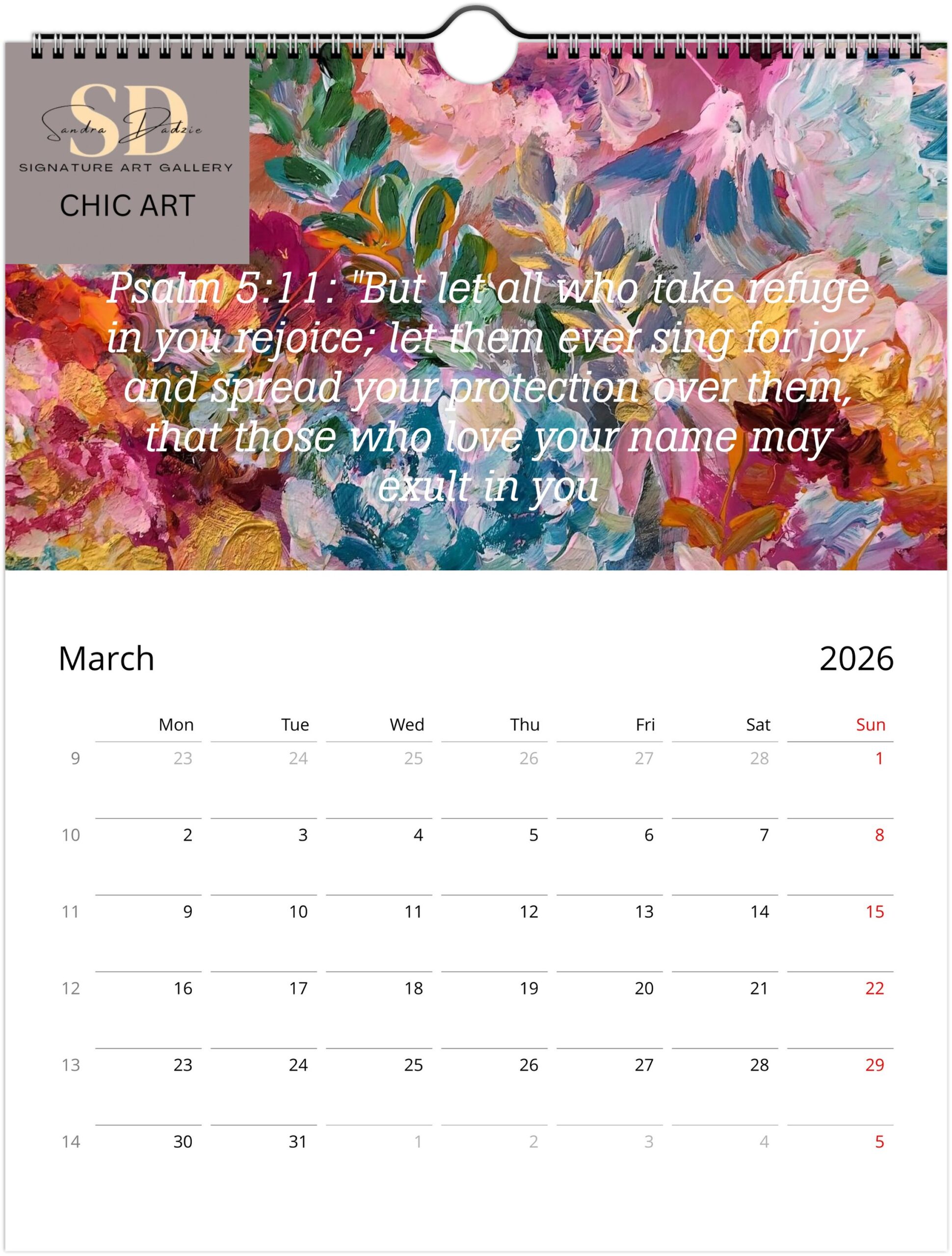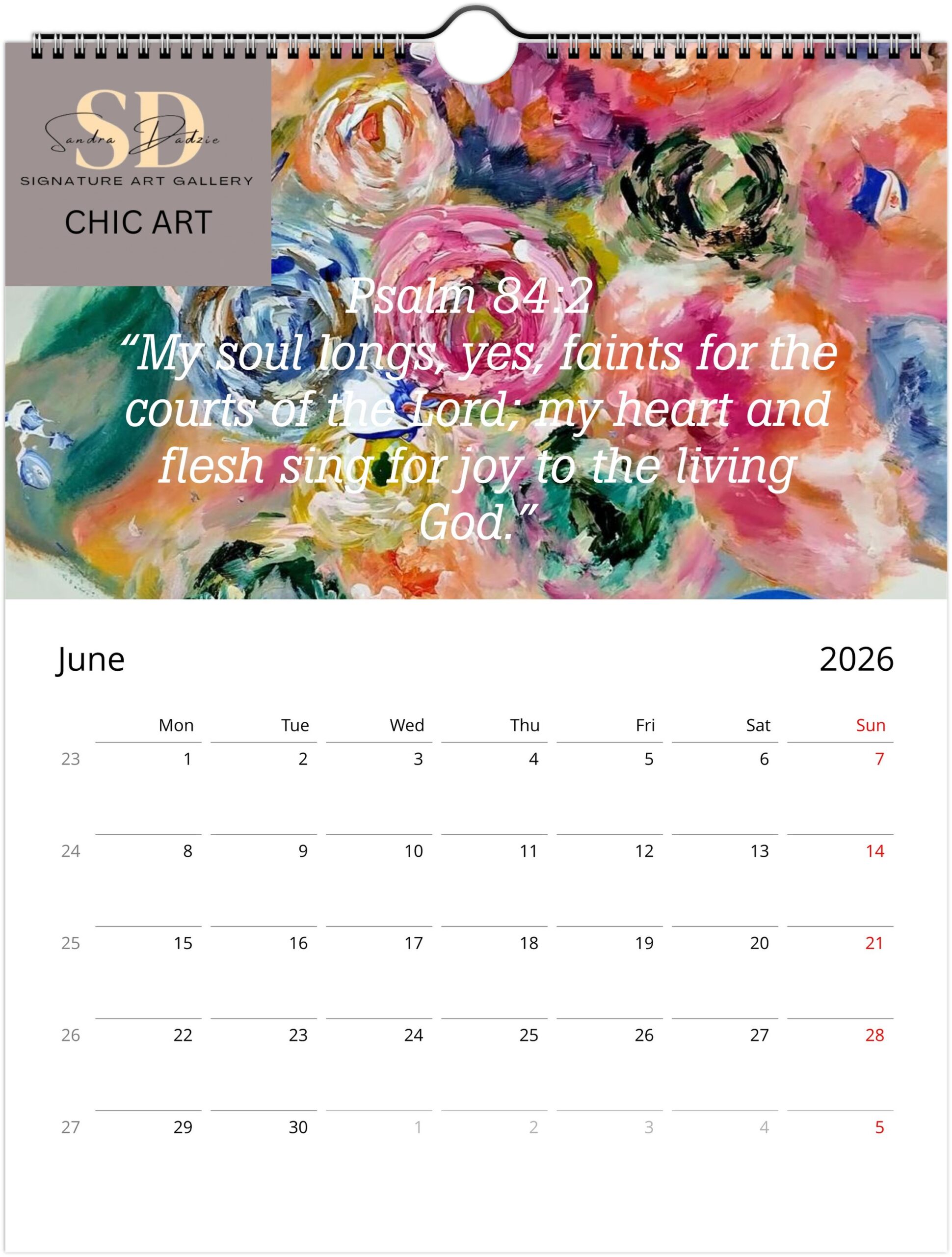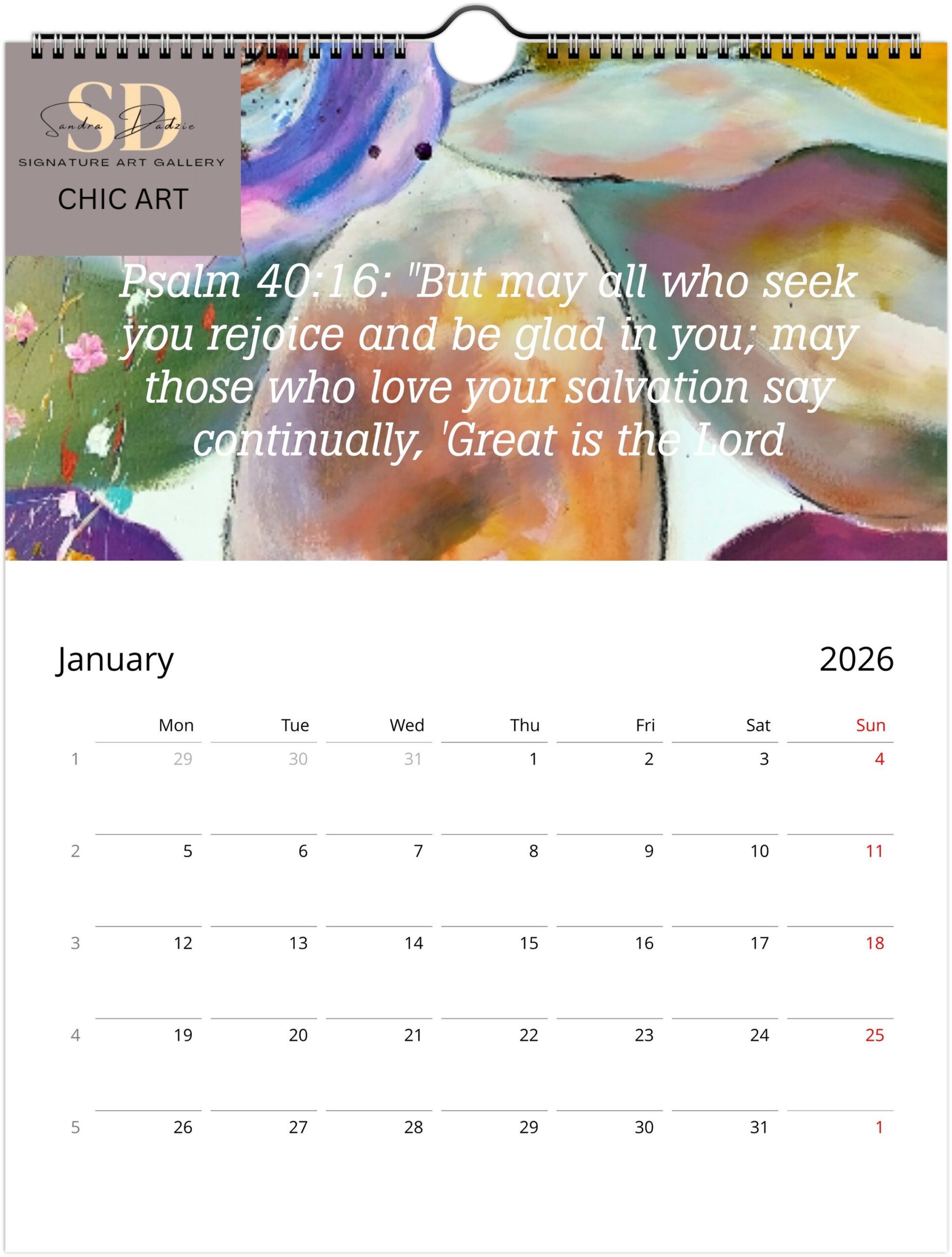 Celebrate each new month of 2026 with beauty, color, and encouragement. This inspirational art calendar combines vibrant, heartfelt artwork with joyful Bible verses to fill your year with peace, purpose, and positivity.