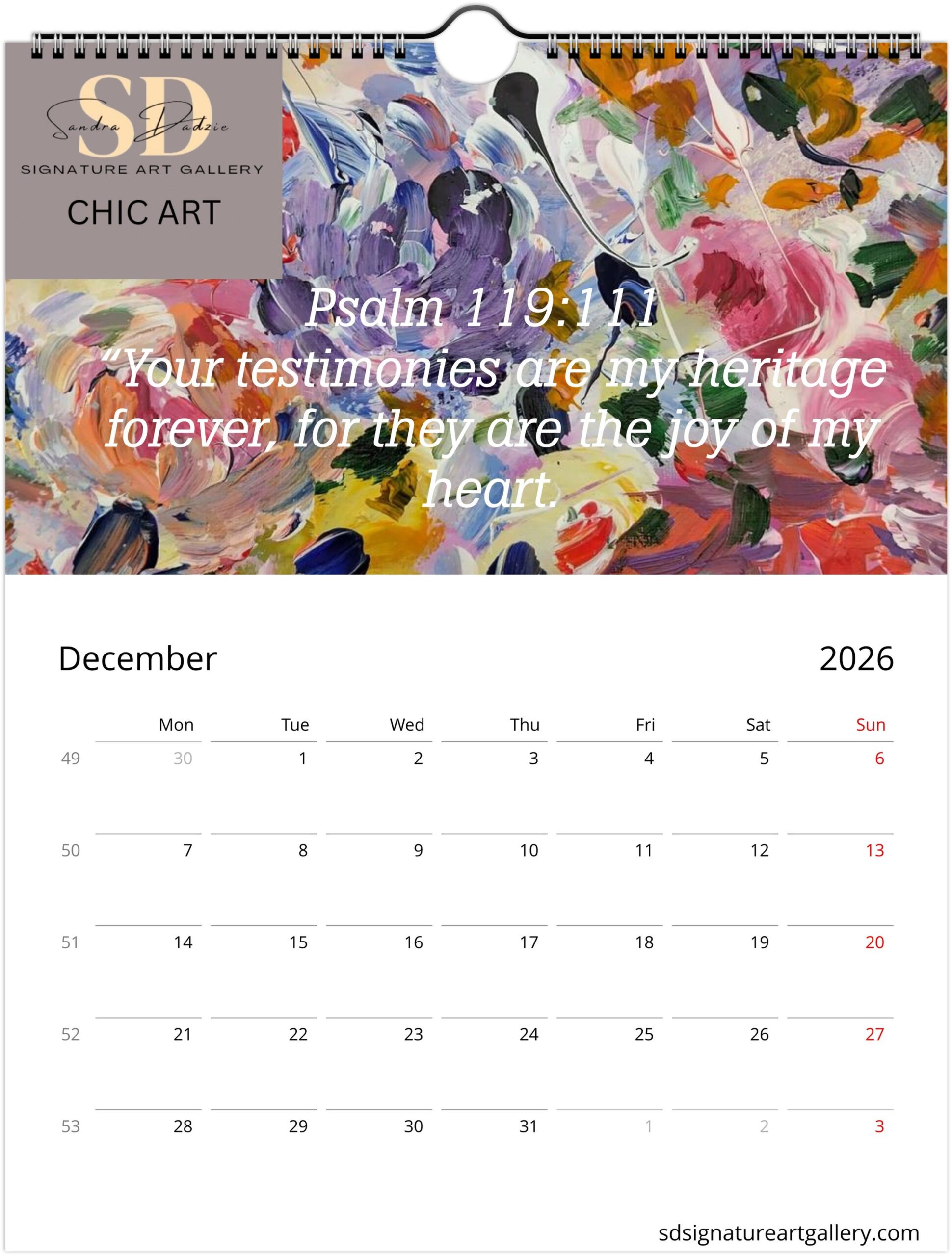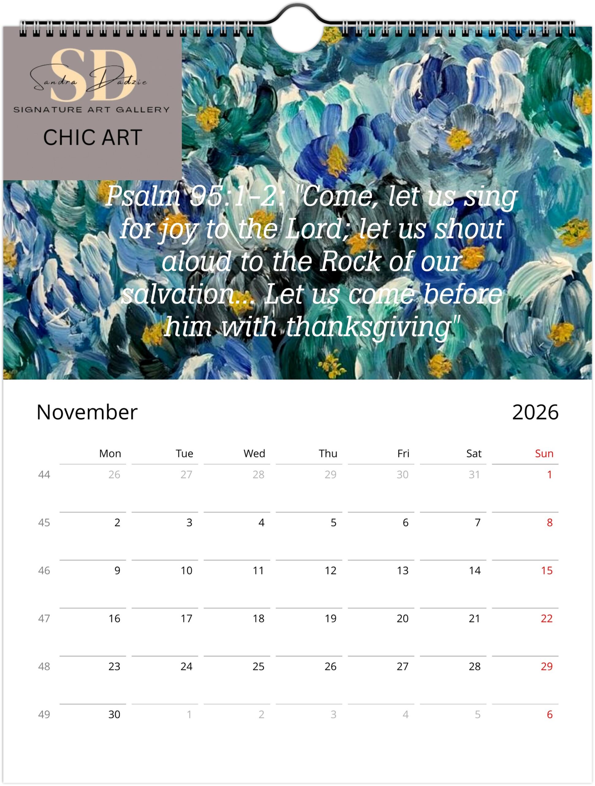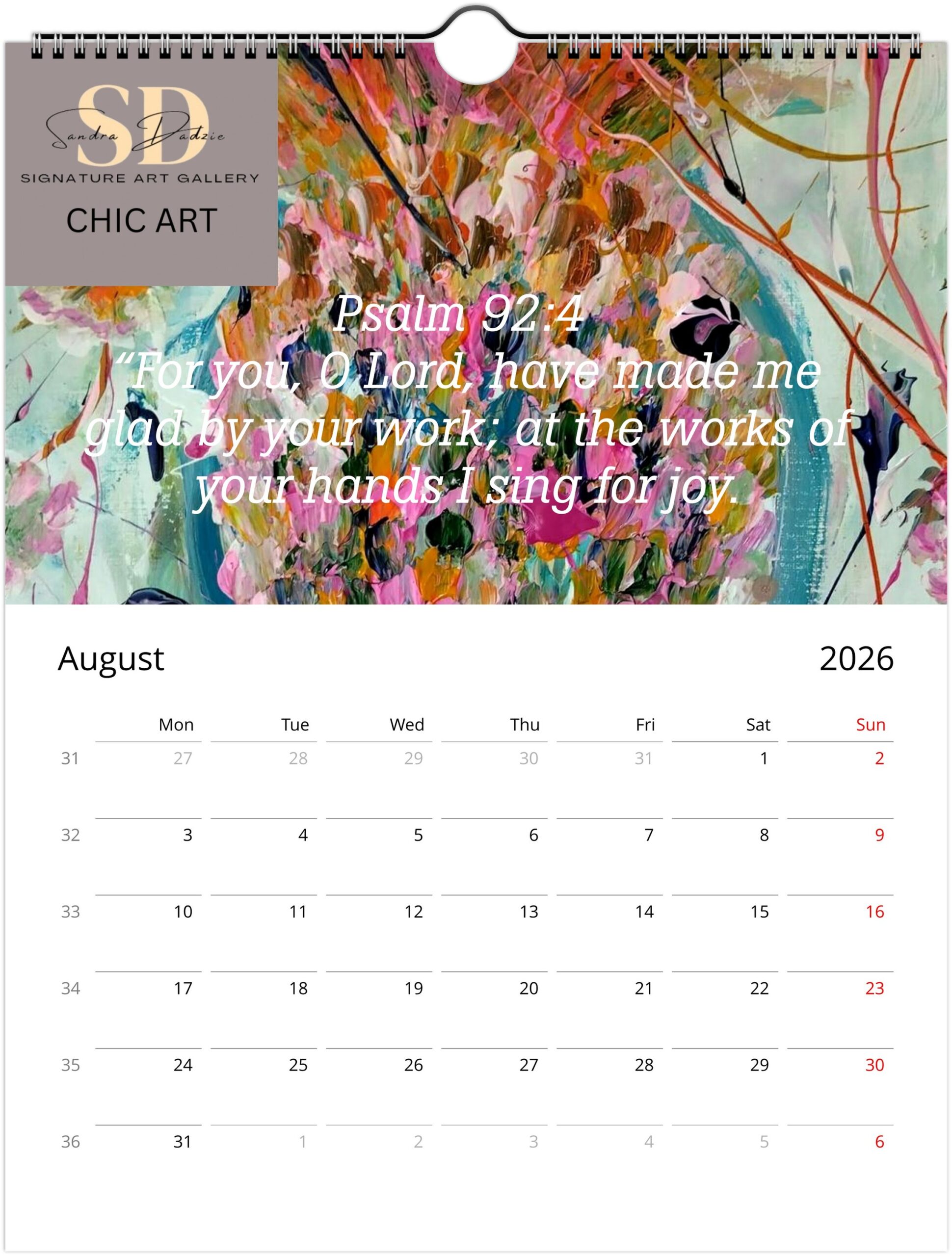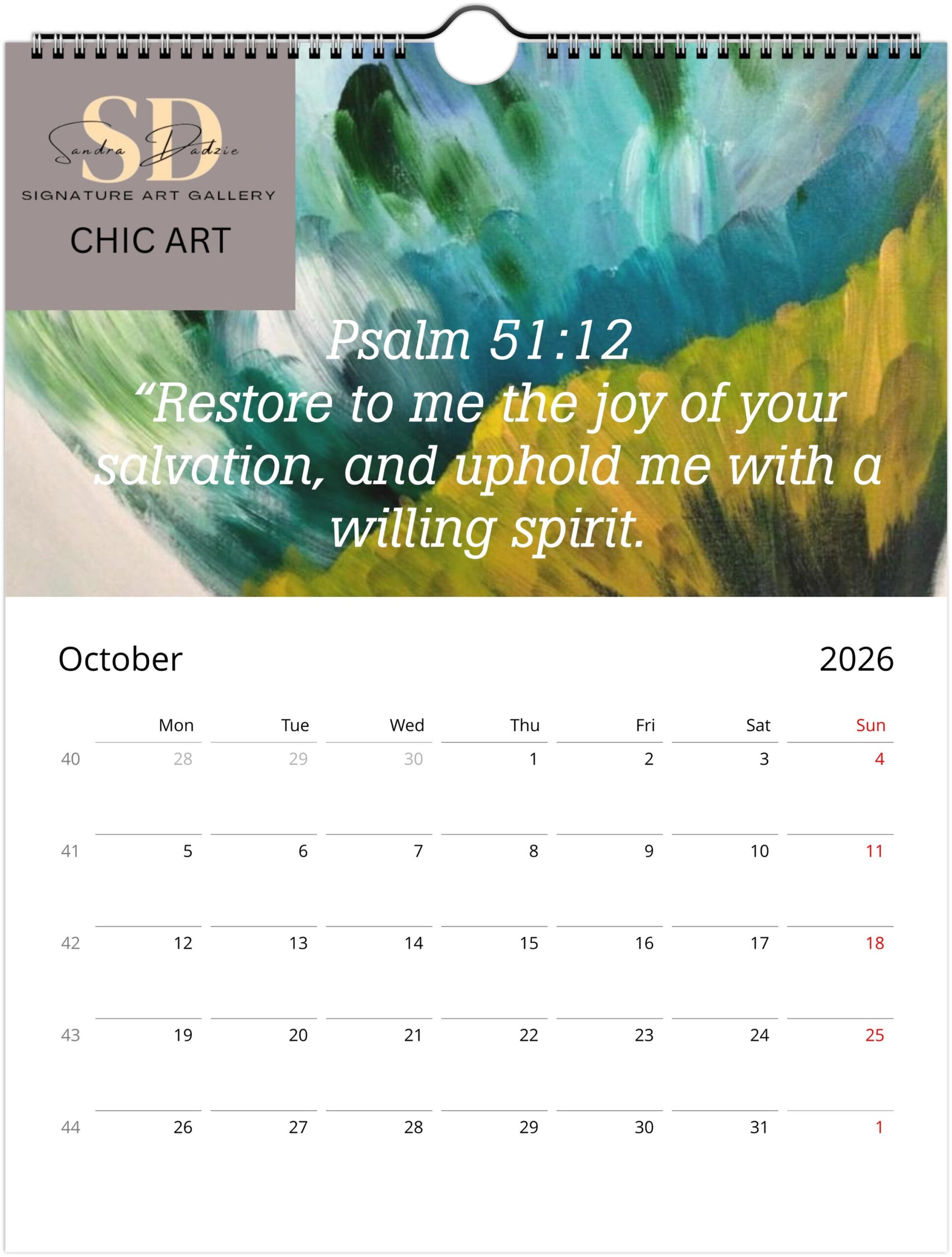 Celebrate each new month of 2026 with beauty, color, and encouragement. This inspirational art calendar combines vibrant, heartfelt artwork with joyful Bible verses to fill your year with peace, purpose, and positivity.