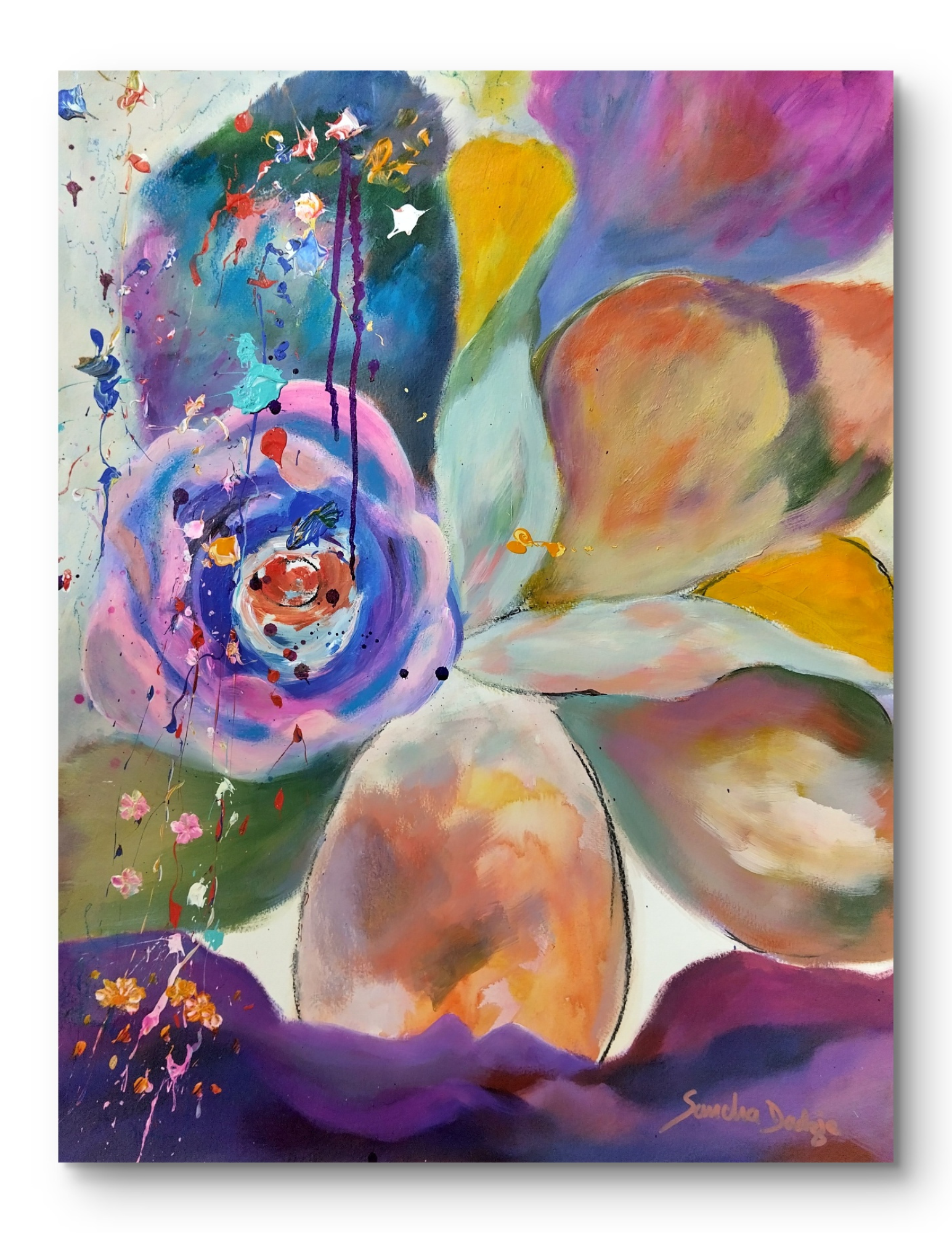 is a vibrant floral painting that speaks the language of love, emotion, and divine beauty. The bouquet, arranged gracefully in a glass vase, bursts with rich, warm tones orange, pinks, and golds symbolizing deep affection of emotional and spiritual passion ,a passion of heart . Each petal seems alive with feeling, as if echoing the heartbeat of passion and devotion. The light reflecting through the vase adds purity to the intensity, revealing that true passion flows from a heart touched by love and grace.